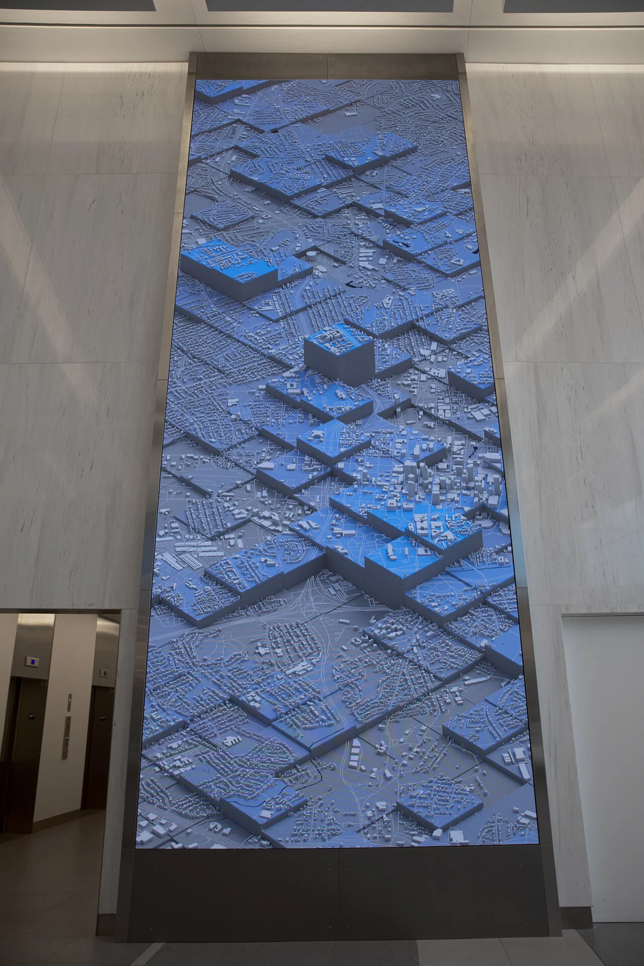 Spectrum wanted to engage employees and visitors alike with this new communication channel. We worked with them to define the communication strategy, focusing on their Brand, People, Technology, and Scale. We developed a fresh look for the brand for the installation: softly shaded layers in isometric space, with angles based on the arrow of the Spectrum logo. We worked across client teams to source high-quality photography and videography of the employees on the ground. To tell the story of the network, we focused on 12 cities the company serves, highlighting their cultural icons and creating data visualizations of network activity in the city over time. Finally, we created a set of editorial templates so that the client could roll out their own content within a consistent design framework.